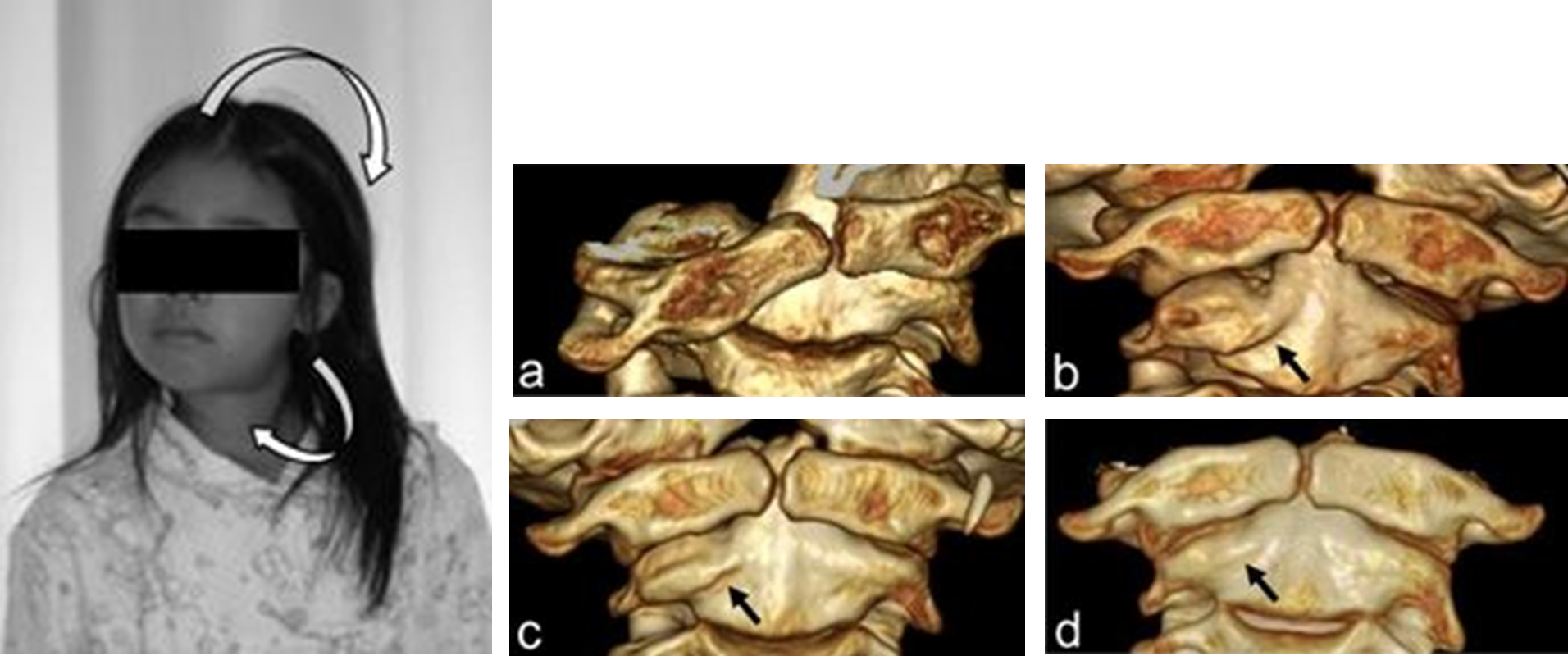 (コマドリが首を傾けている姿)を呈する病態です。環軸関節が亜脱臼し、首が傾いたまま動かなくなってしまいます。環軸関節発症早期のAARFの多くは、局所の安静や頚椎カラー、あるいは牽引療法などの保存治療に反応し、良好な経過をたどります。しかしながら、発症後2-3ヵ月以上経過した陳旧性のAARFにおいては、C2
