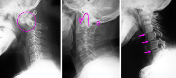 図 (左)環軸関節亜脱臼(AAS)(まん中)垂直性亜脱臼(VS)(右)軸椎下亜脱臼(SAS)