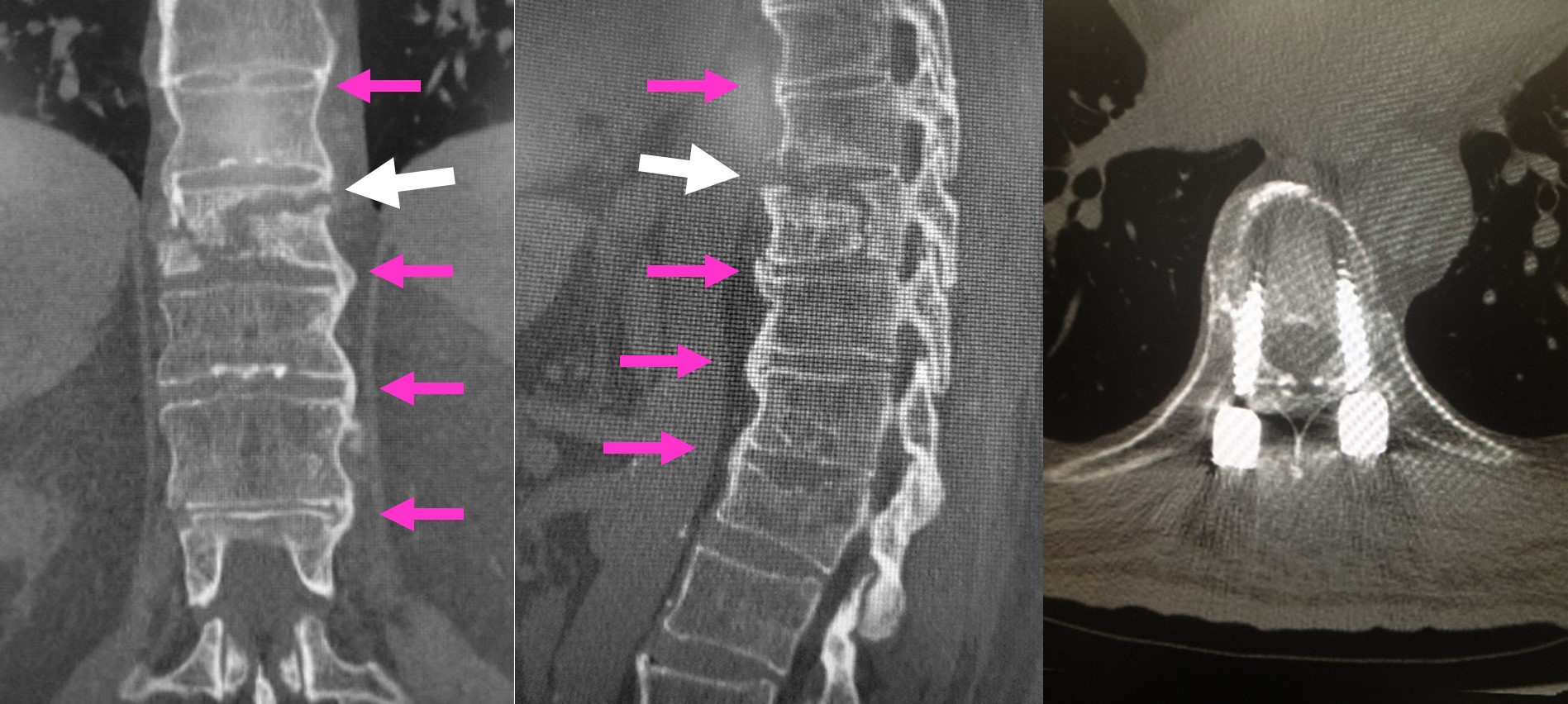 (左、まん中)DISHで骨癒合(ピンク矢印)をしていましたが、転落で一部骨折を生じています(白矢印)。