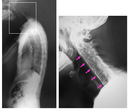 (右)左の写真の四角の部分(頚椎)のX線です。全ての頚椎がくっついています。