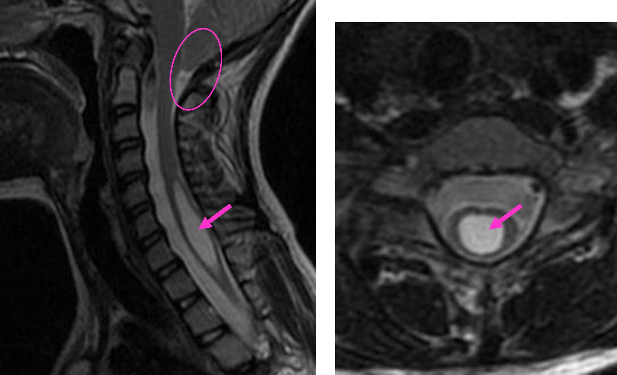 (右)脊髄の横断像では、脊髄の中に空洞(シリンクス)が形成されています(矢印で示す部分)。