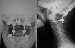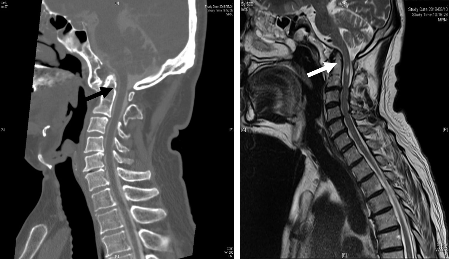 (左)第2頚椎歯突起が頭蓋骨内に陥入し、延髄と脊髄を圧迫している。