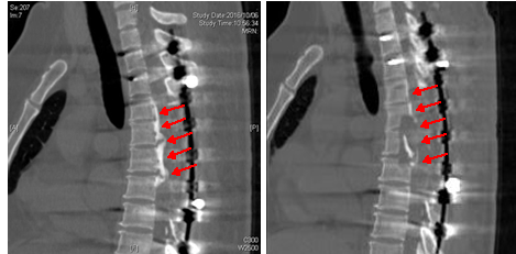 (左)術前CTでは、胸椎高位に著明な後縦靭帯の骨化がみられます。