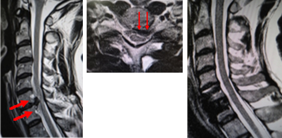 図(左、まん中)術前MRI:首の骨の間のクッション(椎間板)が脊柱管へ飛び出し、脊髄を強く圧迫しています。