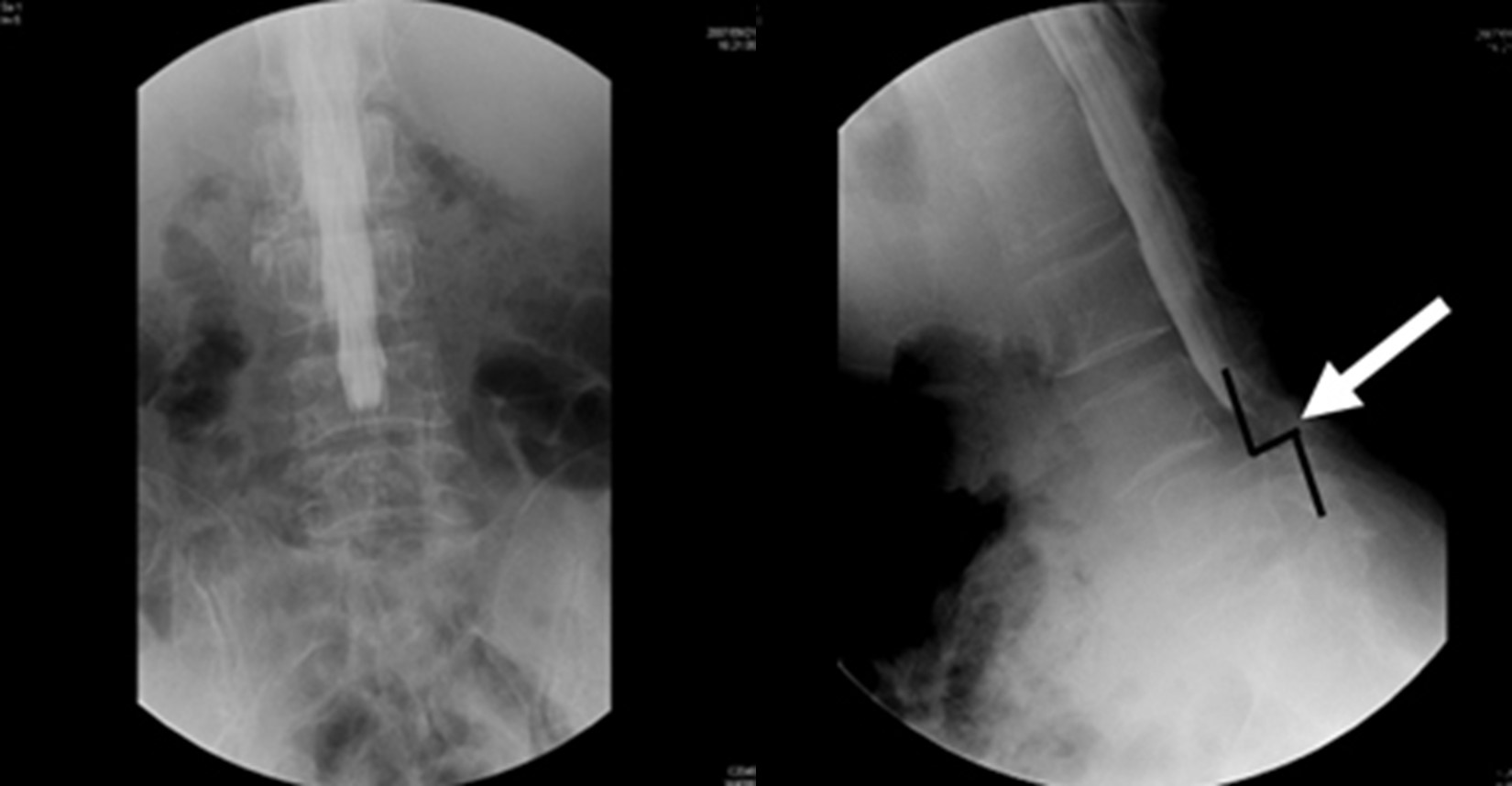 図 手術前:階段状に脊椎(せぼね)がずれています。(矢印で示す部分)