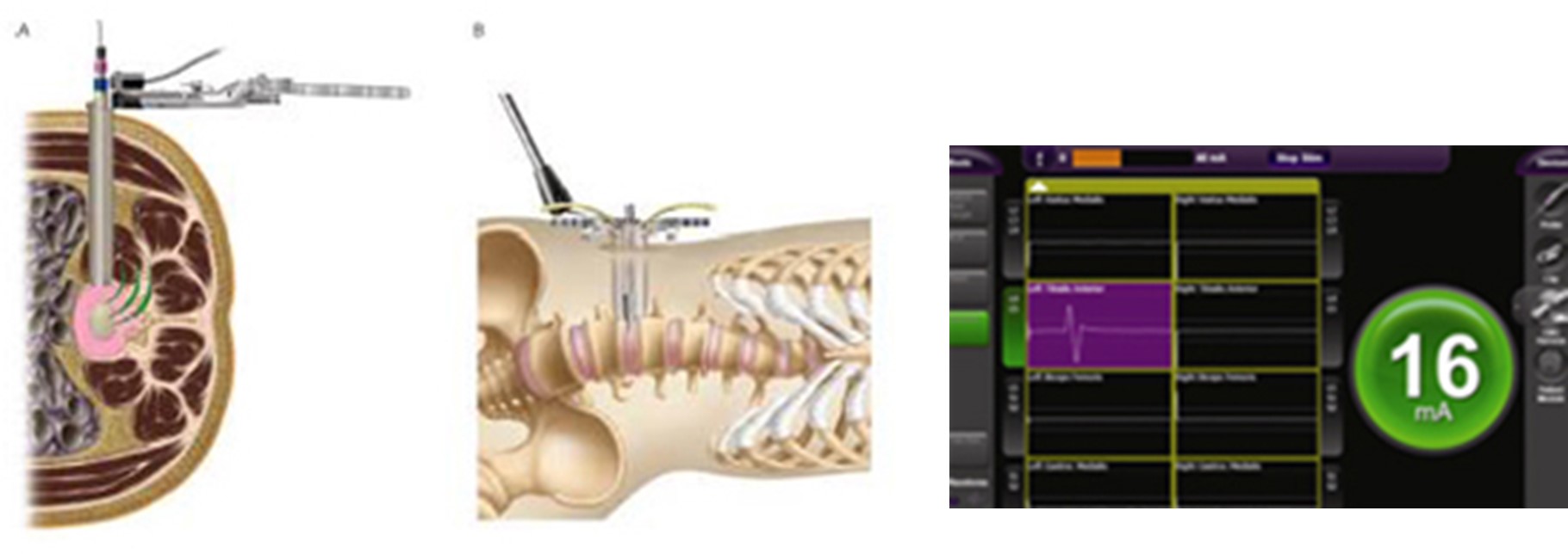 下の図のように神経機能を随時確認し重要な神経を避けながら椎間板内に人工骨を移植します。その後、腰部を小さく切ってインプラントで固定術を行います。対象となる疾患は、腰椎椎間板ヘルニア、腰部脊柱管狭窄症、腰椎変性すべり症、腰椎変性側弯症、成人脊柱変形、腰椎後弯症、腰椎分離すべり症の一部などです。原則、手術翌日より起立・歩行を開始します。