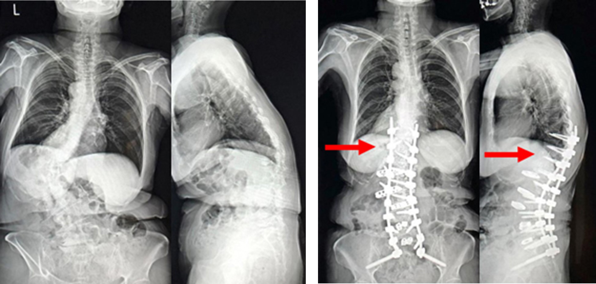 (右)術後のX線画像。胸椎と腰椎に対する側方経路椎体間固定術(XLIF:エックスリフ)を行い、良好な矯正が得られています。