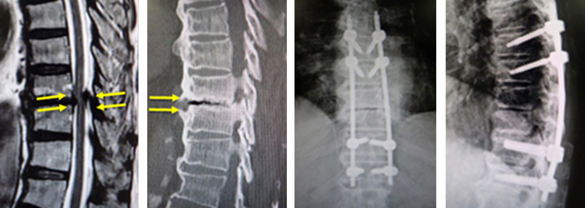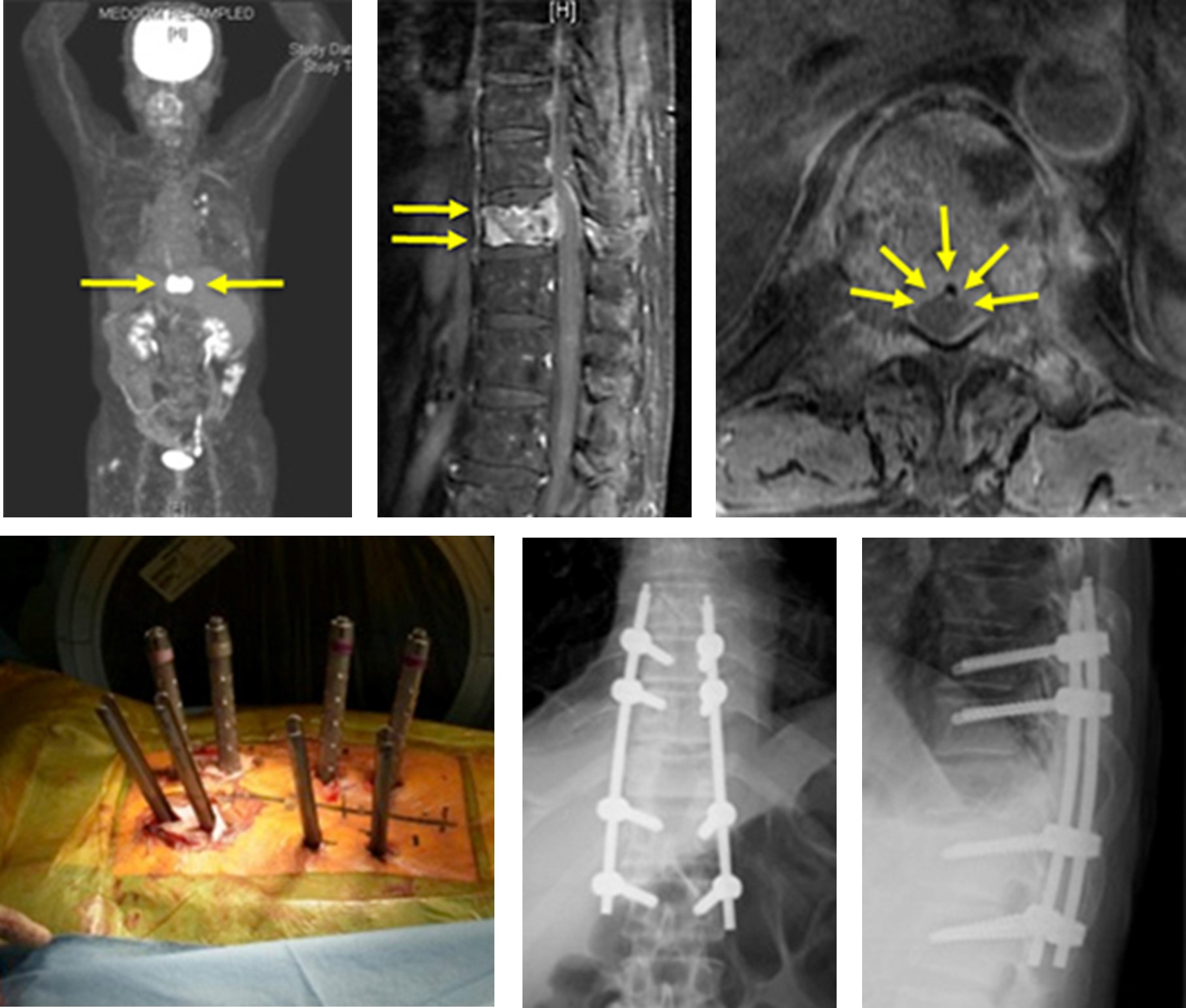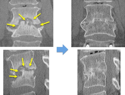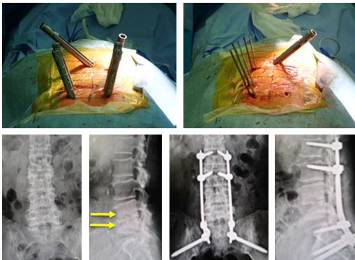 図 (上)第4番目、5番目の椎体が感染し、進行性の骨破壊と後弯変形を認めます。大きな切開を加えること無く、経皮的椎弓根スクリューを用いた特殊な方法で、脊椎を安定化しています。